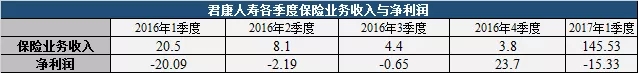 同时慧保天下还注意到,2017年1季度君康人寿保险业务收入145.5亿元,同比增加610%,环比增加3781%,净利润却大幅亏损达15.3亿元,同时综合偿付能力充足率下降至160.83%。