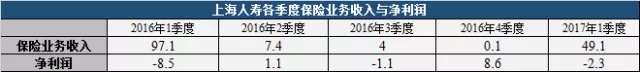上海人寿在2015年度净利润亏损5.02亿元,2016年一季度保费收入近百亿,占全年保费收入的89%,却再度亏损8.5亿元,2016年四季度保险收入仅为0.1亿,却实现利润8.6亿,扭转了全年亏损的局面。而2017年一季度保险收入49.1亿元,环比上升幅度巨大,而净利润亏损2.3亿。