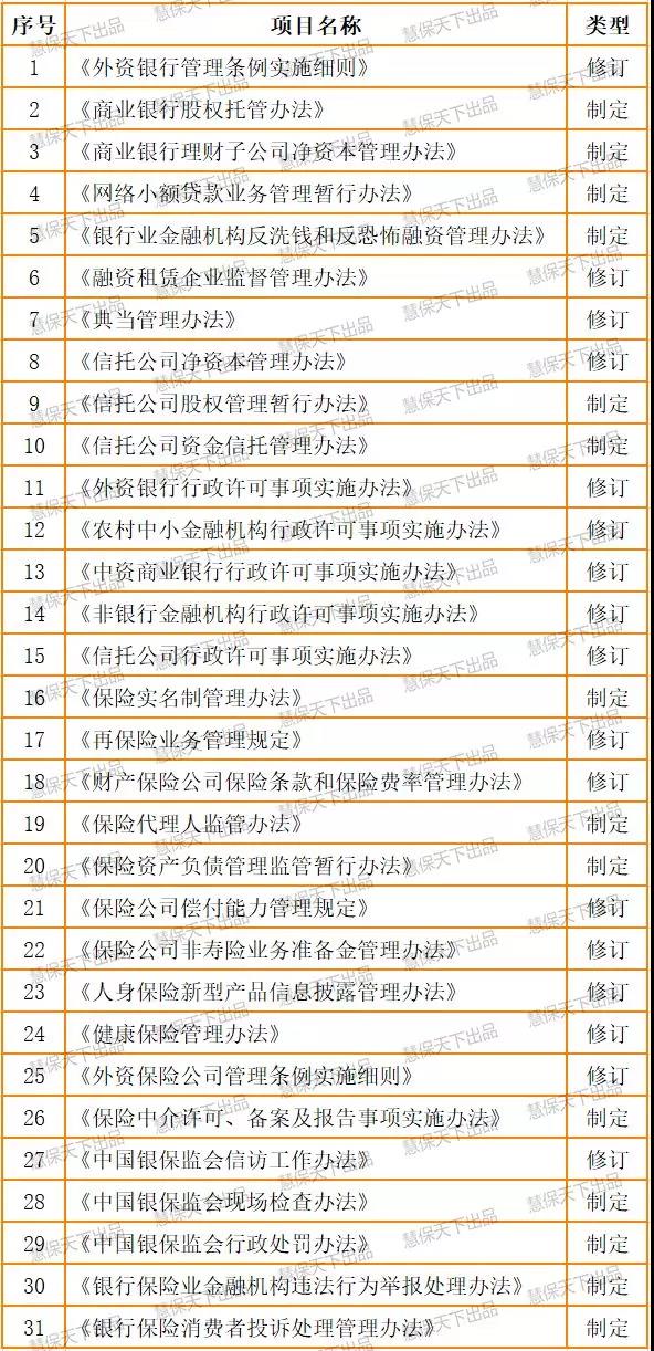 4月30日,银保监会官网发布《中国银保监会2019年规章立法工作计划》,共涉及31项规章办法的修订或制定,其中约半数直接涉及保险行业,具体内容如下: