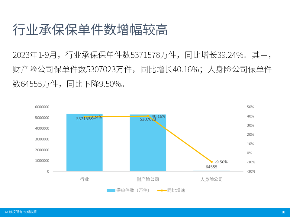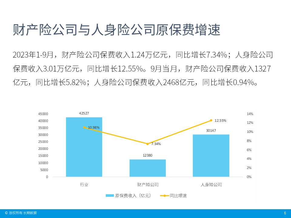 就行业负债端整体表现而言,2023年1-9月,行业原保费收入4.25万亿元,同比增长10.98%,增速较去年同期增加6.04个百分点。同期,行业赔付支出1.38万亿元,同比增长20.14%,增速较去年同期增加21.11个百分点。