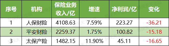 其中,人保财险保险业务收入4108.63亿元,同比增长7.59%;平安产险保险业务收入2259.37亿元,同比增长1.75%;太保产险保险业务收入1482.15亿元,同比增11.9%。