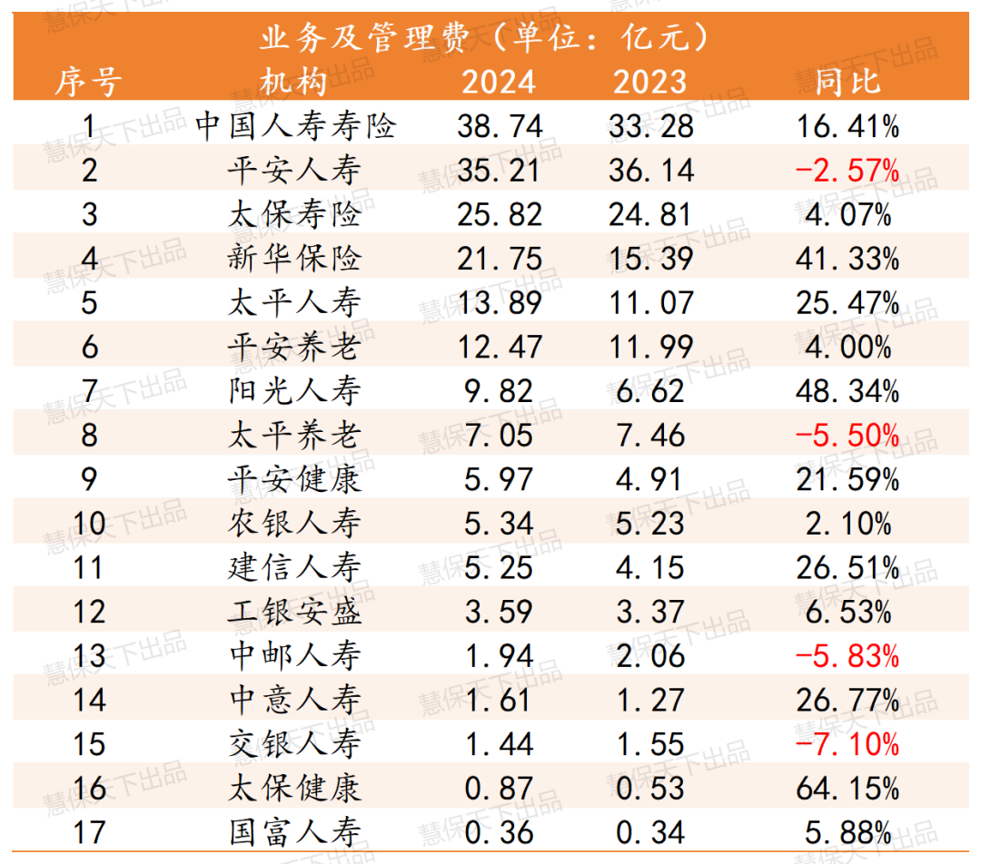 从同比增速来看,有超过半数险企实现业务及管理费压降,节支效果初显。其中信美人寿、恒安标准养老、大家养老、弘康人寿、北大方正人寿等多家险企降幅超过15%,其中,信美人寿更是从2023年的4.2亿元削减至2.74亿元,降幅达34.76%。