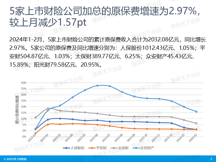 1-2月,人保财险、平安产险、太保产险、阳光产险、众安在线5家上市财险公司的累计原保费收入为2032.08亿元,同比增长2.97%,上述公司保费收入均同比增长,其中,阳光产险增幅达20.95%。