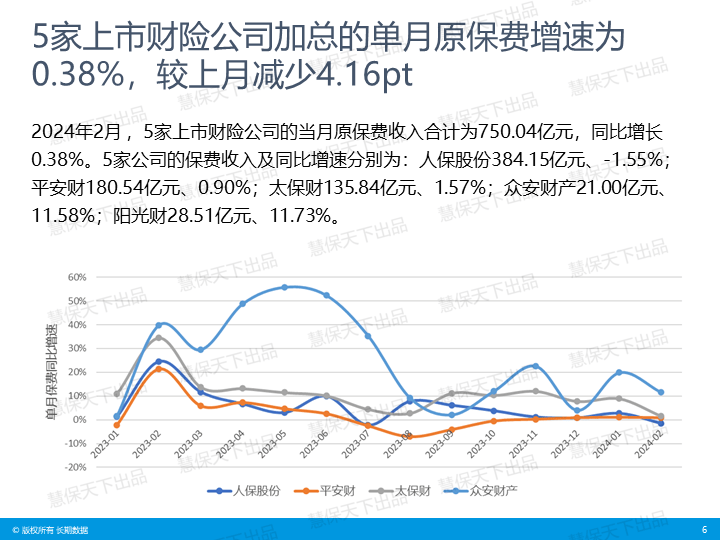 具体来看,5家上市财险公司前2月的保费收入及同比增速分别为: