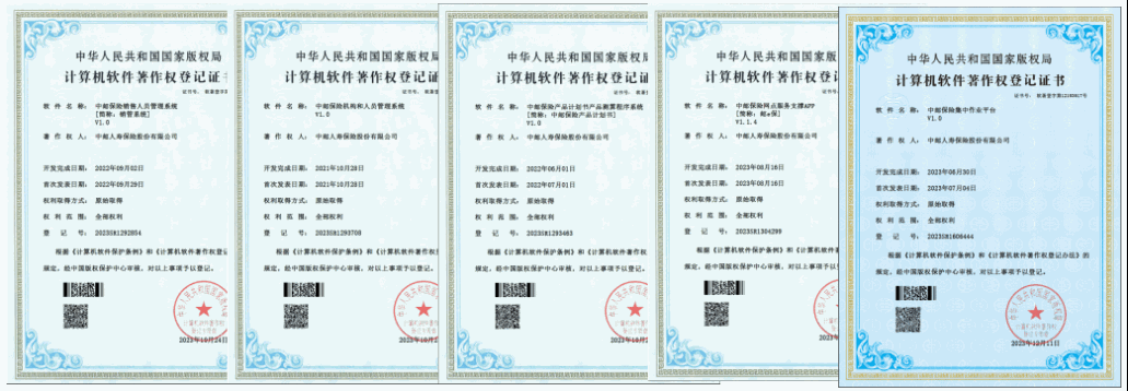 2023年12月,中邮保险销售人员管理系统、机构和人员管理系统、产品计划书产品测算程序系统、网点服务支撑APP及集中作业平台5个信息系统获得中国版权保护中心颁发的计算机软件著作权登记证书,展现了在自主研发能力建设、应用软件创新及无形资产价值提升方面取得的重大进步。
