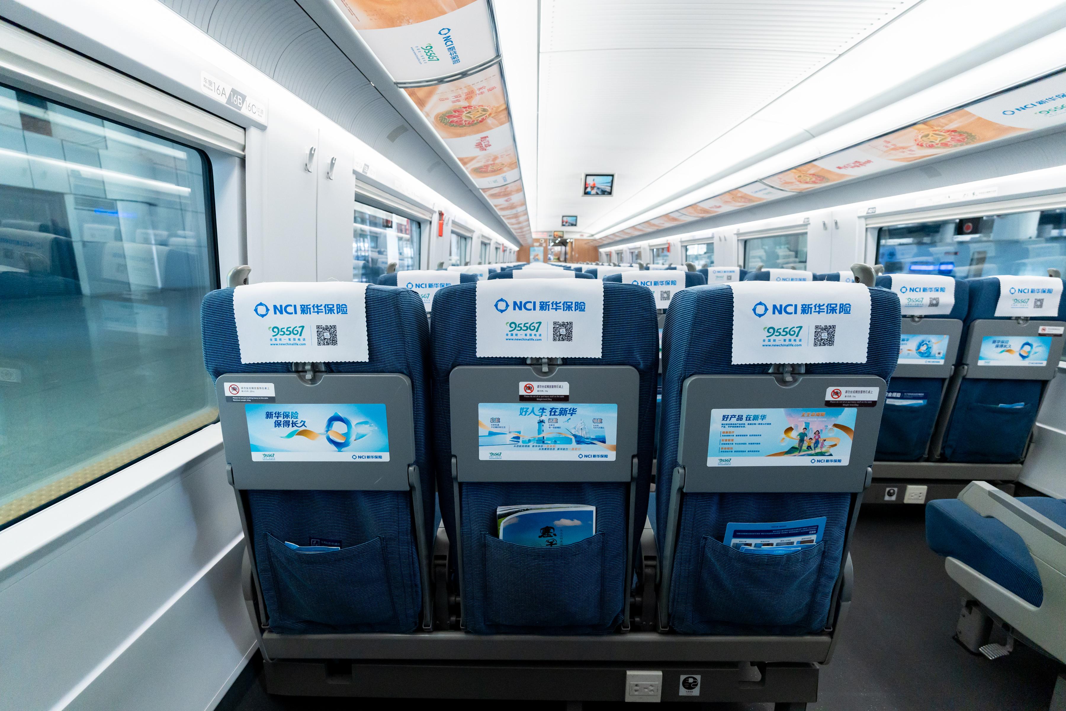 新华保险冠名品牌专列围绕“保得长久”核心价值主张,打造了丰富的视觉传播场景。列车车身贴有“新华保险 保得长久”品牌口号,车厢内设有主题海报、座椅头片、桌板广告、天幕灯箱、LED屏等多点位传播阵地,系统展示新华保险在以分红险为代表的多元产品体系、品牌实力、客户服务等领域的核心优势。
