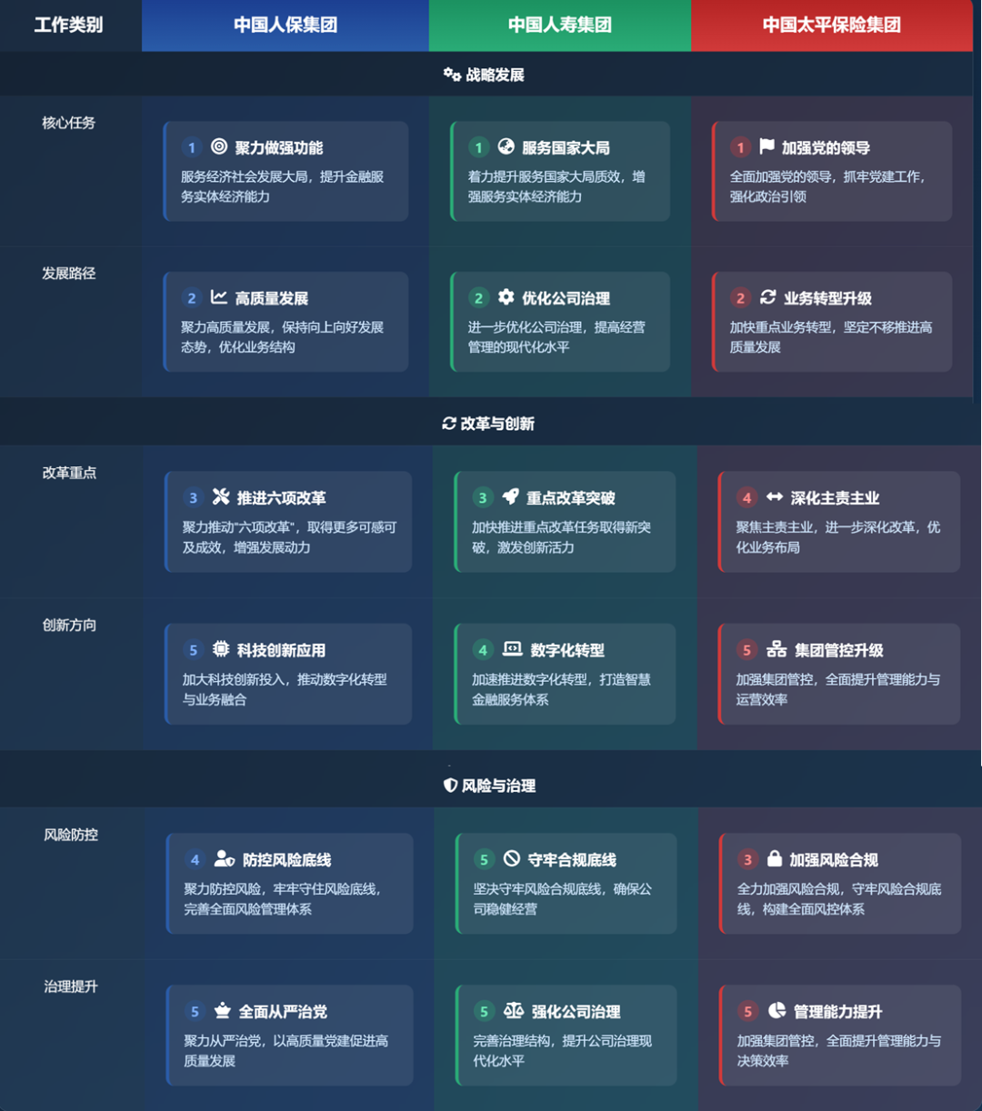 加强党的全面领导:党建与业务融合成为央企特色,无论是集团还是子公司,都反复提到以高质量党建促进高质量发展,党建与经营“两手抓、两促进”已经成为国有保险公司的基调。
