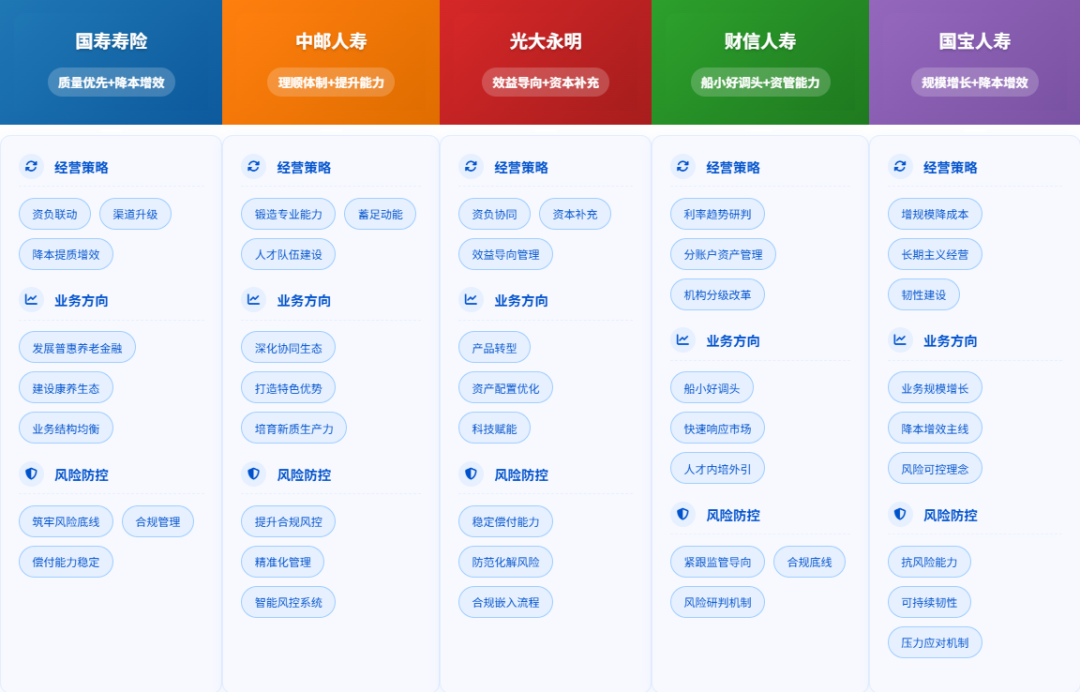 分析当前行业情况,国宝人寿认为正处于转型突破的关键攻坚期,挑战依然严峻复杂,核心业务指标持续承压,行业转型对经营理念、队伍能力提出更高要求,风险防控压力日益增大。