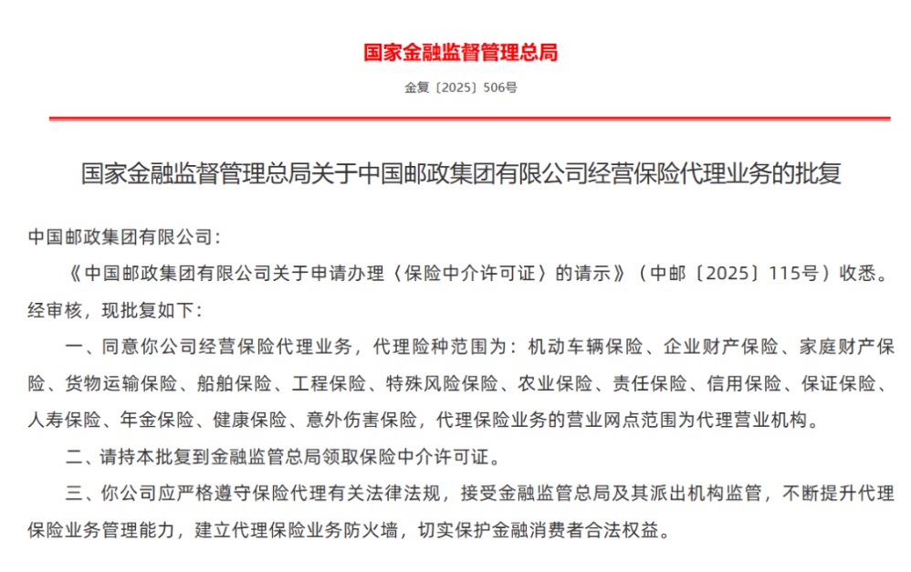 11月24日,国家金融监督管理总局官网发布《关于中国邮政集团有限公司经营保险代理业务的批复》,同意中国邮政集团有限公司经营保险代理业务。根据批复文件,其代理险种范围涵盖各类财产险和人身险:机动车辆保险、企业财产保险、家庭财产保险、货物运输保险、船舶保险、工程保险、特殊风险保险、农业保险、责任保险、信用保险、保证保险、人寿保险、年金保险、健康保险、意外伤害保险。代理保险业务的营业网点范围为代理营业机构,即中国邮政集团下设的保险代理业务网点。