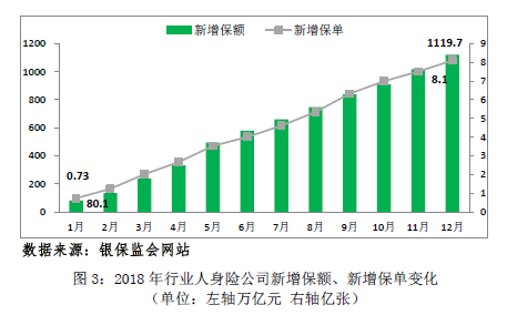 2018年以来,银保监会深化“保险姓保”,进一步加强对行业回归本源引导,首次对“风险保障金额”与“保单件数”指标进行月度公开披露。2018年,行业人身险公司当年累计新增保险金额1119.7万亿元,新增保单8.1亿张。