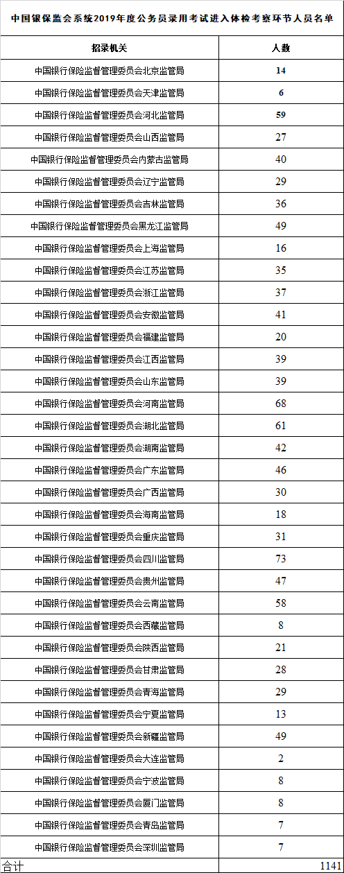 近日,中国银保监会官网公布了2019年度系统公务员录用考试入围体检和考察环节人员名单,共计1141名,包含438名社会人员和703名毕业生。